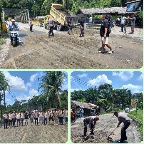 12 Agustus 2025. Kapolsek Bahorok AKP Tunggul Situmeang, S.H, bersama personilnya melakulan penimbunan jalan yang rusak untuk menghindari terjadinya kecelakaan lalulintas dan pungli dijalanan.