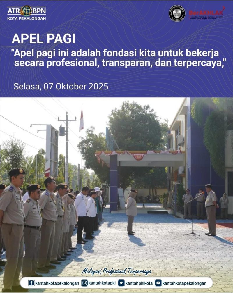 “Apel pagi ini adalah fondasi kita untuk bekerja secara profesional, transparan, dan terpercaya,” menyoroti pentingnya kegiatan ini dalam menjaga kualitas layanan Kantah Kota Pekalongan di tengah tuntutan zaman yang semakin modern.