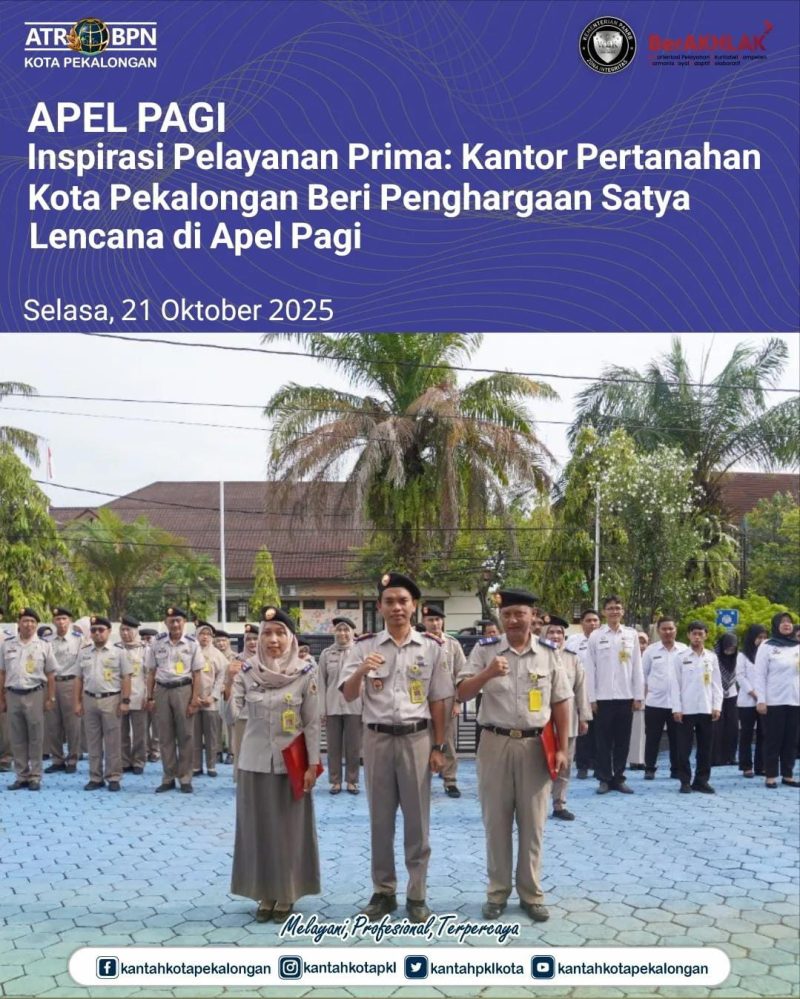 Selasa, 21 Oktober 2025 Semangat pagi menyelimuti halaman depan Kantor Pertanahan Kota Pekalongan. Dipimpin langsung oleh Kepala Kantor, Bapak Joko Wiyono, seluruh jajaran pegawai melaksanakan apel pagi rutin mingguan, apel pagi yang biasanya menjadi ajang konsolidasi dan penyampaian arahan kerja, hari ini diselipkan momen penuh apresiasi. Kantor Pertanahan Kota Pekalongan memberikan penghargaan bergengsi Satya Lencana Satya Karya 10 Tahun kepada dua orang pegawai teladan.