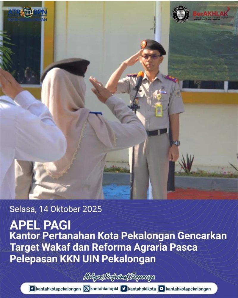 Pekalongan, 14 Oktober 2025 Semangat untuk mempercepat program strategis nasional oleh jajaran Kantor Pertanahan Kota Pekalongan dalam kegiatan apel pagi rutin mingguan yang digelar di halaman depan kantor. Apel yang dipimpin langsung oleh Kepala Kantor, Joko Wiyono dan dihadiri seluruh jajaran pegawai ini menjadi momentum penegasan kembali komitmen institusi dalam mengejar target program pertanahan yang bersentuhan langsung dengan kepentingan umat dan masyarakat.