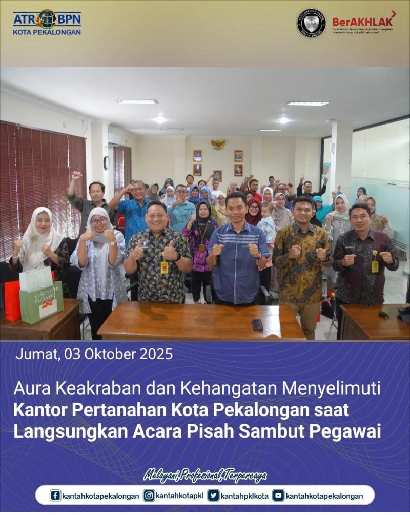 Jumat, 3 Oktober 2025 Aura keakraban dan kehangatan menyelimuti Kantor Pertanahn Kota Pekalongan saat dilangsungkannya acara pisah sambut bagi para Pejabat Pengawas.