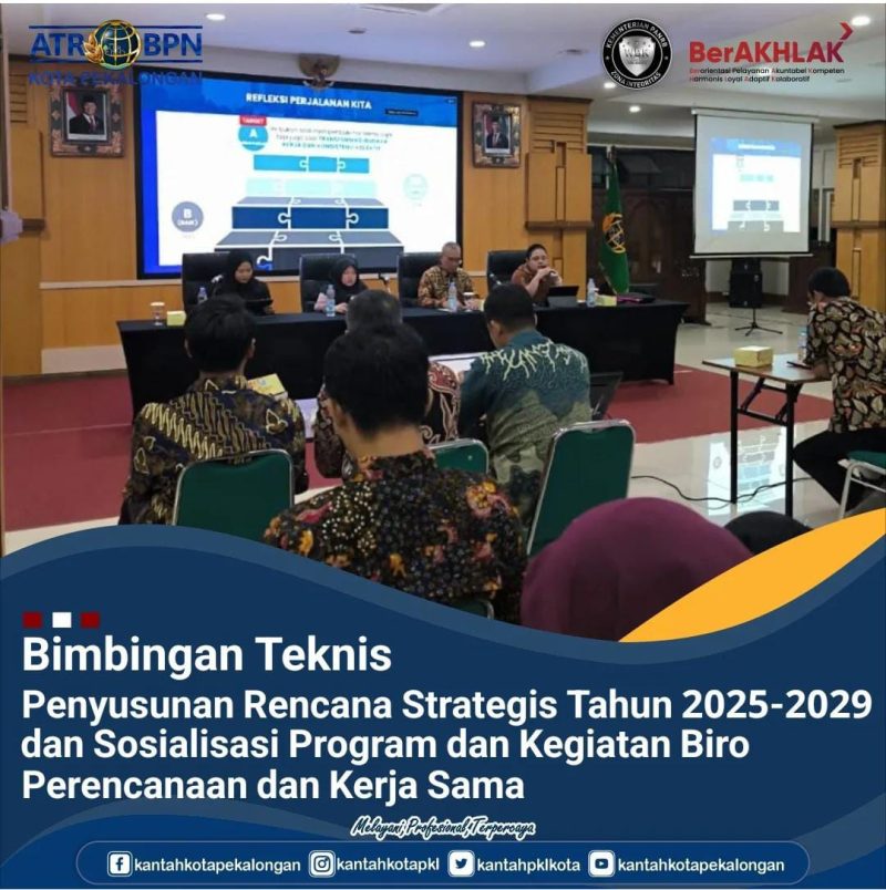 Pada hari Kamis, 31 Juli 2025 Plt. Kepala Sub Bagian Tata Usaha Kantor Pertanahan Kota Pekalongan beserta tim perencanaan dan keuangan menghadiri Undangan dari Kantor Wilayah BPN Provinsi Jawa Tengah dalam rangka Bimbingan Teknis (Bimtek) Penyusunan Rencana Strategis (Renstra) Tahun 2025-2029 dan Sosialisasi Program dan Kegiatan Biro Perencanaan dan Kerja Sama, bertempat di Aula Sentosa Kanwil BPN Provinsi Jateng.