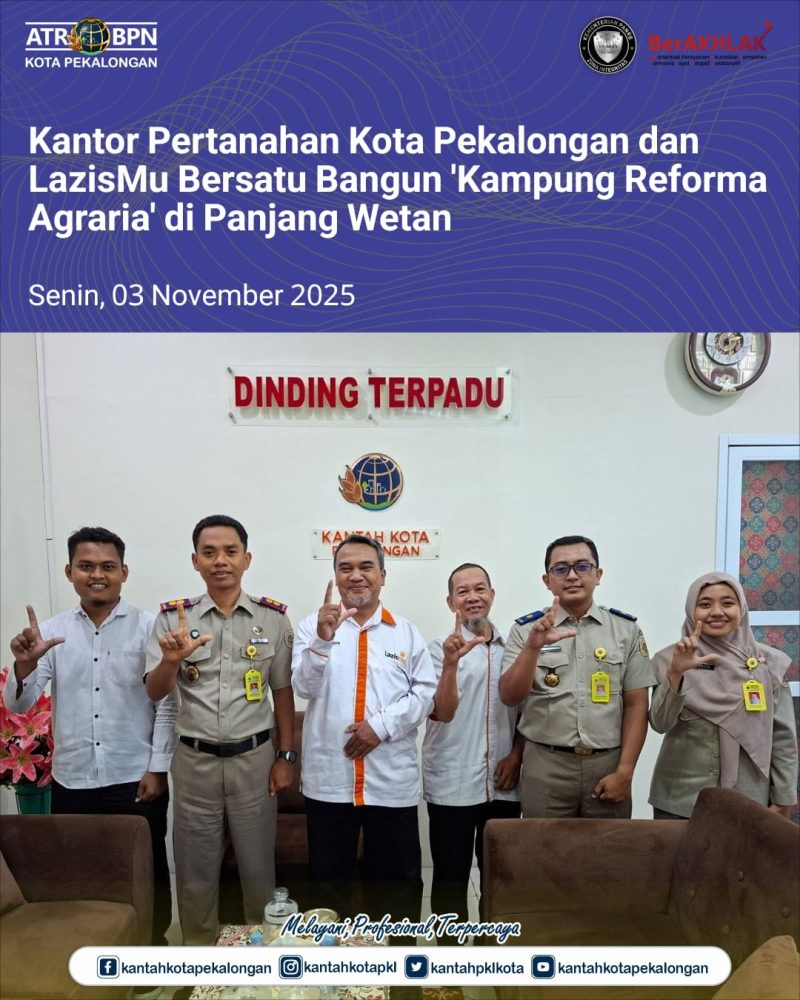 Senin, 3 November 2025 Upaya mewujudkan kesejahteraan masyarakat melalui penataan aset dan akses tanah mendapat dukungan dari berbagai pihak. Hari ini, Kantor Pertanahan Kota Pekalongan menjalin sinergi dengan Lembaga Amil Zakat, Infaq, dan Sedekah Muhammadiyah (LazisMu) Kabupaten Pekalongan. Kerja sama strategis ini difokuskan untuk mendukung pembangunan program unggulan “Kampung Reforma Agraria” yang berlokasi di Kampung Bugisan, Kelurahan Panjang Wetan, Kecamatan Pekalongan Utara.
