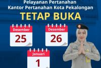 “Libur Tetap Produktif!” Kantor Pertanahan Kota Pekalongan tetap hadir melayani di tanggal: 📆 25-26 Desember 2025 dan 1 Januari 2026 ⏱️ Pukul 09.00 –…