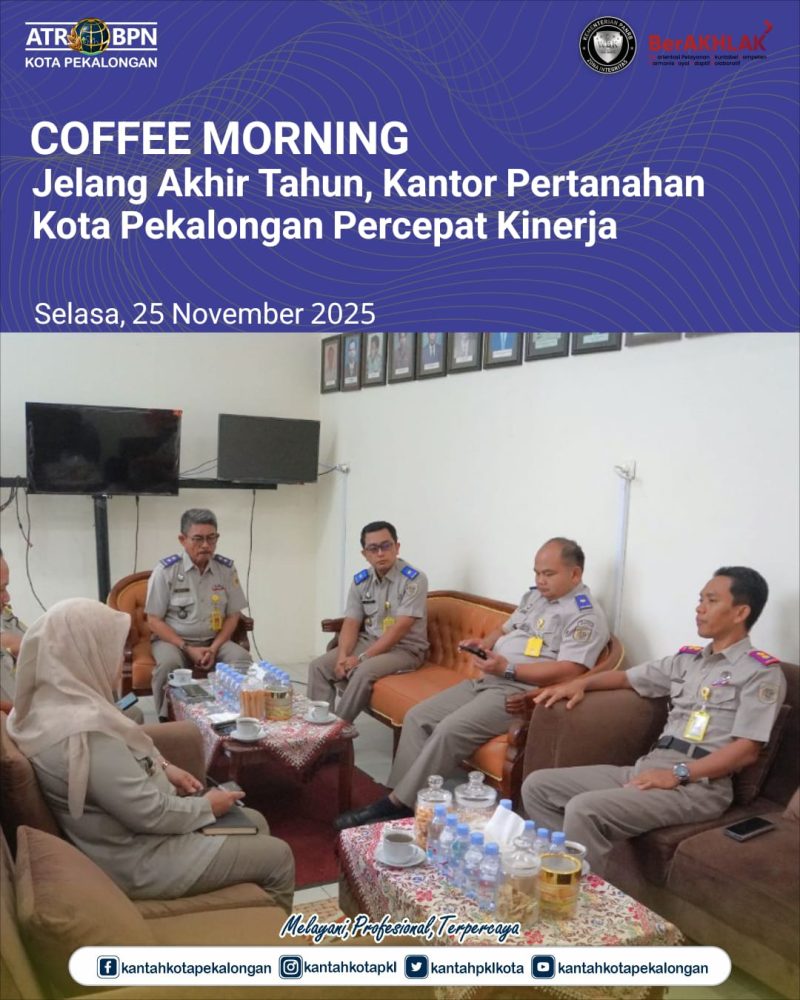 Selasa, 25 November 2025 Menghadapi jelang penutupan tahun anggaran, Kantor Pertanahan Kota Pekalongan melaksanakan kegiatan Coffee Morning yang dipimpin langsung oleh Kepala Kantor, Bapak Joko Wiyono.
