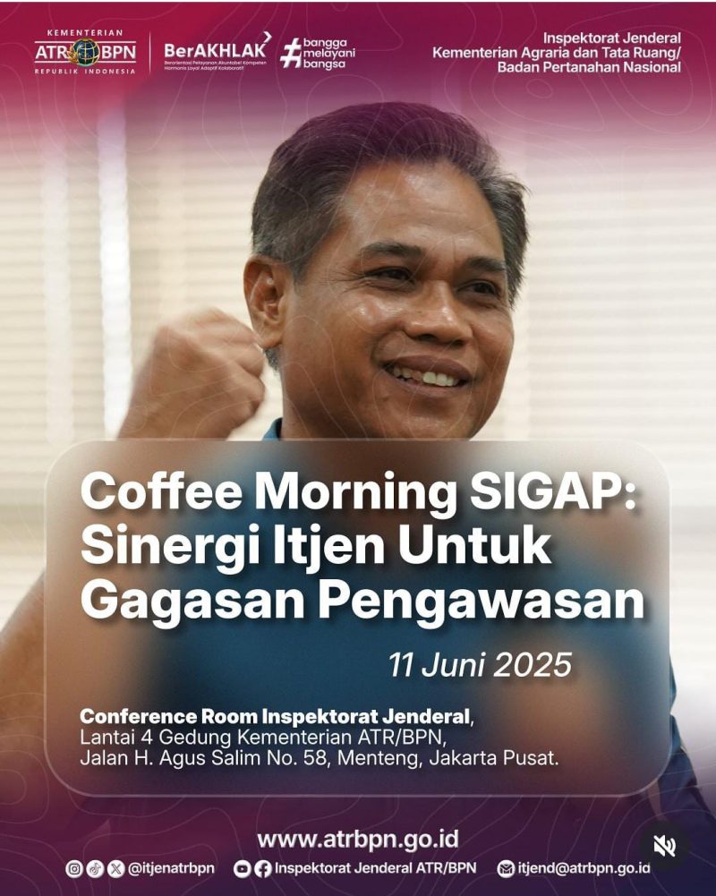 Jakarta – Dalam upaya mendorong budaya kerja yang terbuka, kolaboratif, dan humanis, Inspektorat Jenderal Kementerian Agraria dan Tata Ruang/Badan Pertanahan Nasional (ATR/BPN) resmi meluncurkan program baru bertajuk Coffee Morning SIGAP (Sinergi Itjen untuk Gagasan Pengawasan)