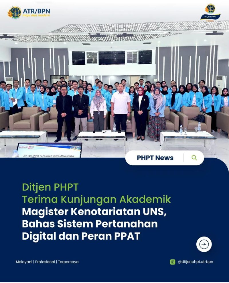Direktorat Jenderal Penetapan Hak dan Pendaftaran Tanah (Ditjen PHPT) menerima kunjungan akademik dari Program Studi Magister Kenotariatan, Fakultas Hukum, Universitas Sebelas Maret (UNS) di Aula Prona, Kementerian ATR/BPN, pada Selasa (15/07/2025). Kegiatan ini merupakan bagian dari komitmen Ditjen PHPT dalam mendukung peningkatan pemahaman generasi muda terhadap sistem pertanahan nasional.