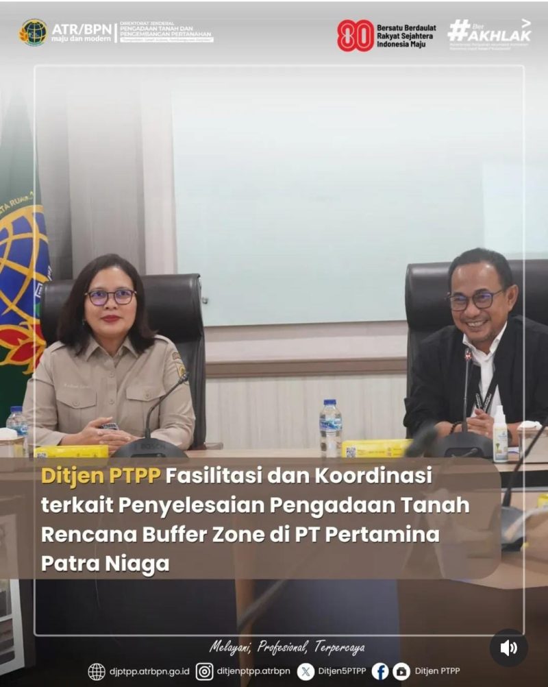 Jakarta, 4 Agustus 2025 – Direktorat Jenderal Pengadaan Tanah dan Pengembangan Pertanahan (Ditjen PTPP), Kementerian ATR/BPN, menyelenggarakan Rapat Fasilitasi dan Koordinasi terkait Penyelesaian Pengadaan Tanah Rencana Buffer Zone di PT Pertamina Patra Niaga.