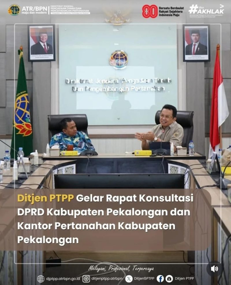 Jakarta, 4 Agustus 2025 – Direktorat Jenderal Pengadaan Tanah dan Pengembangan Pertanahan (Ditjen PTPP), Kementerian ATR/BPN, menyelenggarakan Ditjen PTPP Gelar Rapat Konsultasi DPRD Kabupaten Pekalongan dan Kantor Pertanahan Kabupaten Pekalongan.