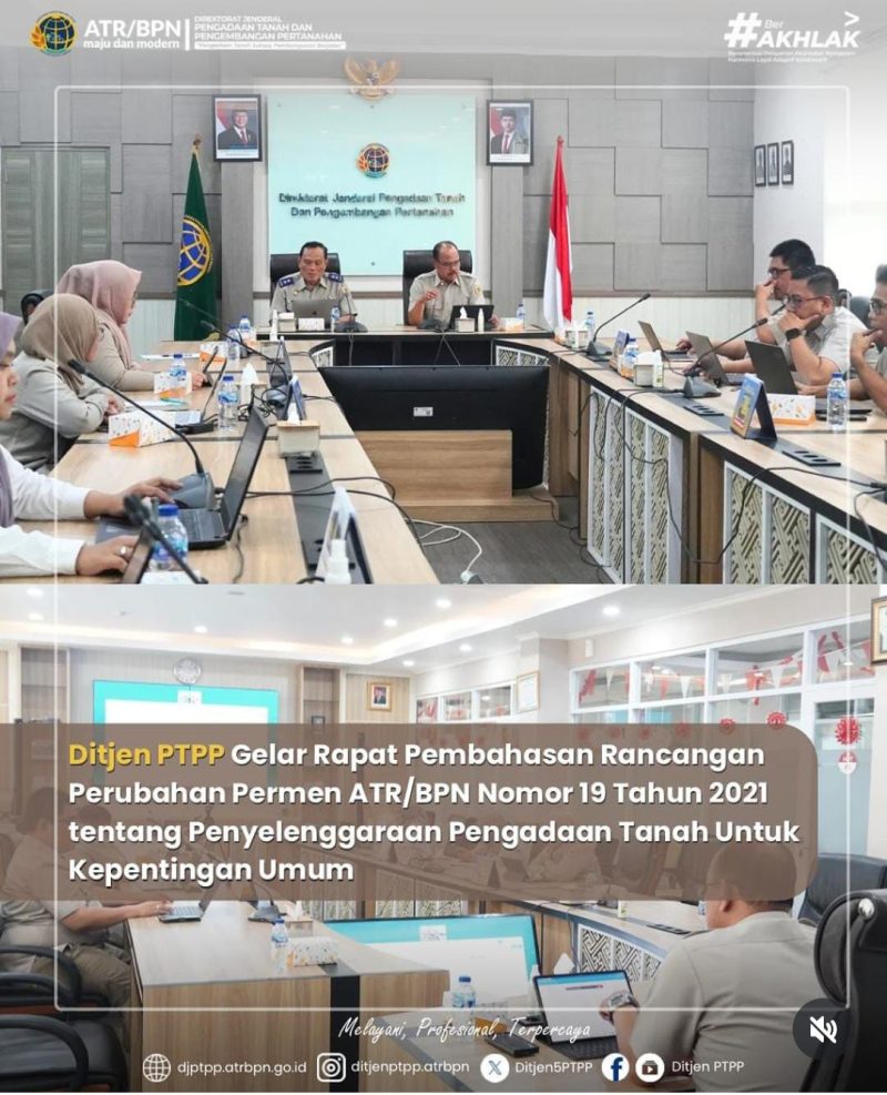 Jakarta – Direktorat Jenderal Pengadaan Tanah dan Pengembangan Pertanahan (Ditjen PTPP) Kementerian ATR/BPN menyelenggarakan rapat pembahasan Rancangan Peraturan Menteri ATR/Kepala BPN tentang Perubahan atas Permen ATR/BPN Nomor 19 Tahun 2021. Rapat berlangsung di Ruang 201 Ditjen PTPP secara luring dan daring. (Kamis 8/9/2025).