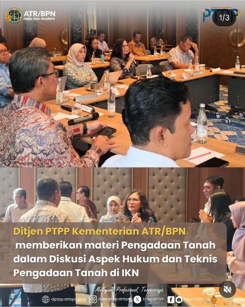 Kalimantan Timur – Kamis, 18 September 2025 Direktur Jenderal Pengadaan Tanah dan Pengembangan Pertanahan (PTPP) Kementerian ATR/BPN, Embun Sari, hadir sebagai narasumber pada Kegiatan Diskusi Aspek Hukum dan Teknis Pengadaan Tanah Secara Langsung oleh Otorita Ibu Kota Nusantara (OIKN) melalui mekanisme jual beli. Acara ini berlangsung di Hotel Swissotel Nusantara.