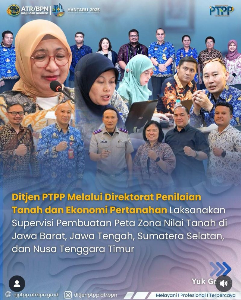 Jakarta, 27 Oktober s/d 1 November 2025 – Direktorat Jenderal PTPP melalui Direktorat Penilaian Tanah dan Ekonomi Pertanahan mengadakan supervisi pengelolaan data ILASPP pada kegaiatan pembuatan peta ZNT pada program ILASPP Tahun 2025 pada Provinsi Jawa Barat, Jawa Tengah, Sumatera Selaran dan Nusa Tenggara Timur.