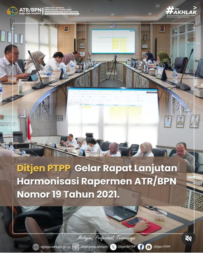 Jakarta, 30 Juli 2025 – Direktorat Jenderal Pengadaan Tanah dan Pengembangan Pertanahan (Ditjen PTPP) Kementerian ATR/BPN terus memperkuat kepastian hukum dalam proses pengadaan tanah melalui Rapat Harmonisasi Lanjutan Rancangan Peraturan Menteri (Rapermen) ATR/BPN Nomor 19 Tahun 2021.