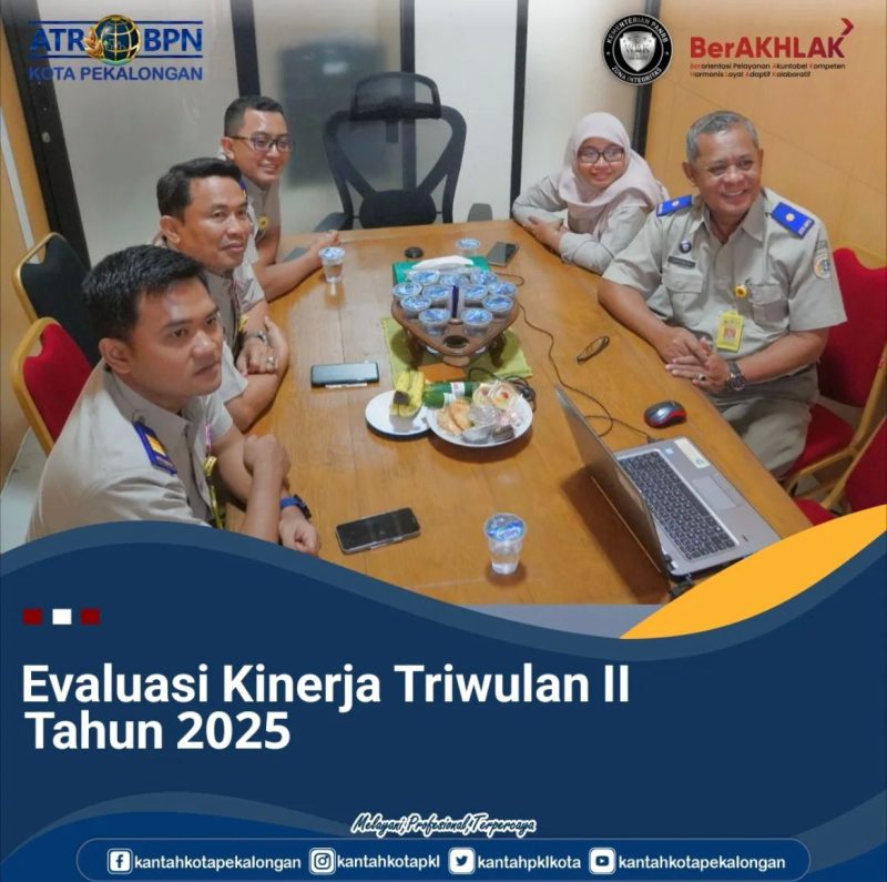 Senin, 14 Juli 2025 Para Pejabat Pengawas Kantor Pertanahan Kota Pekalongan dari Kepala Sub Bagian Tata Usaha, Kepala Seksi Survei dan Pemetaan, Plt. Kepala Seksi Penetapan Hak dan Pendaftaran Tanah, Kepala Seksi Penataan dan Pemberdayaan, Kepala Seksi Pengadaan Tanah dan Pengembangan serta Kepala Seksi Pengendalian dan Penanganan Sengketa menghadiri undangan dari Kementerian ATR/ BPN perihal Evaluasi Kinerja Triwulan II tahun 2025.