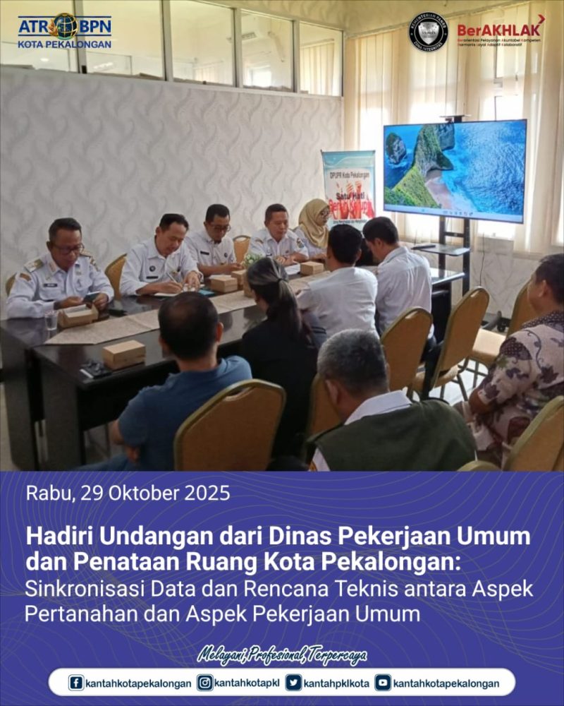 Hai #SobATRBPN pada hari Rabu, 29 Oktober 2025 Kantor Pertanahan Kota Pekalongan menunjukkan peran aktifnya dalam mendukung penataan infrastruktur dan ruang kota, dua pejabat Kantah Pekalongan, Bapak Achmad Zaenuri selaku Kepala Seksi Survei dan Pemetaan dan Bapak Satrio Agung Wibowo Kepala Seksi Penataan dan Pemberdayaan, menghadiri undangan dari Dinas Pekerjaan Umum dan Penataan Ruang (DPUPR) Kota Pekalongan.