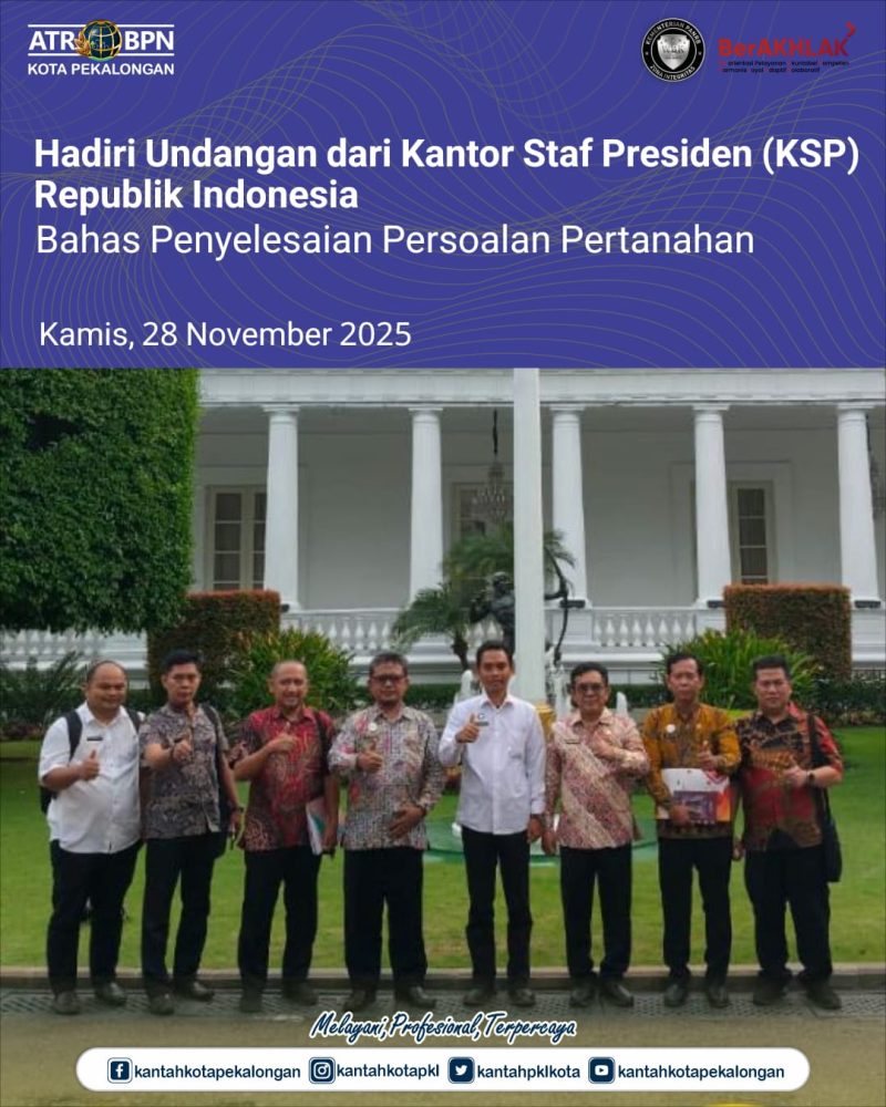 Kamis, 27 November 2025 Kepala Kantor Pertanahan Kota Pekalongan, Bapak Joko Wiyono, didampingi oleh dua Pejabat Pengawas, menghadiri undangan dari Kantor Staf Presiden (KSP) Republik Indonesia.