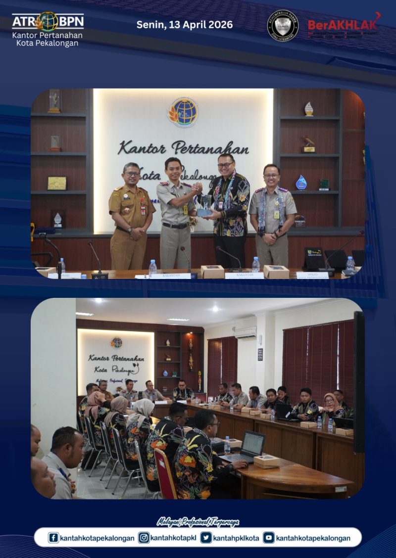 Senin, 13 April 2026, bertempat di Ruang Sekar Arum Kantor Pertanahan Kota Pekalongan, telah dilaksanakan kegiatan integrasi data NIB dan NOP PBB yang melibatkan Kantah Kota Pekalongan bersama Kantah Kota Probolinggo, serta BPKAD Kota Pekalongan dan BPKAD Kota Probolinggo.