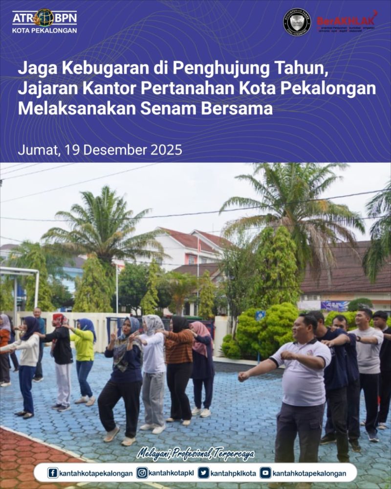 Jumat, 19 Desember 2025 Di tengah padatnya agenda pelayanan akhir tahun, Kantor Pertanahan Kota Pekalongan tetap memprioritaskan kesehatan jajarannya , seluruh pegawai berkumpul di halaman depan kantor untuk melaksanakan kegiatan senam pagi bersama.