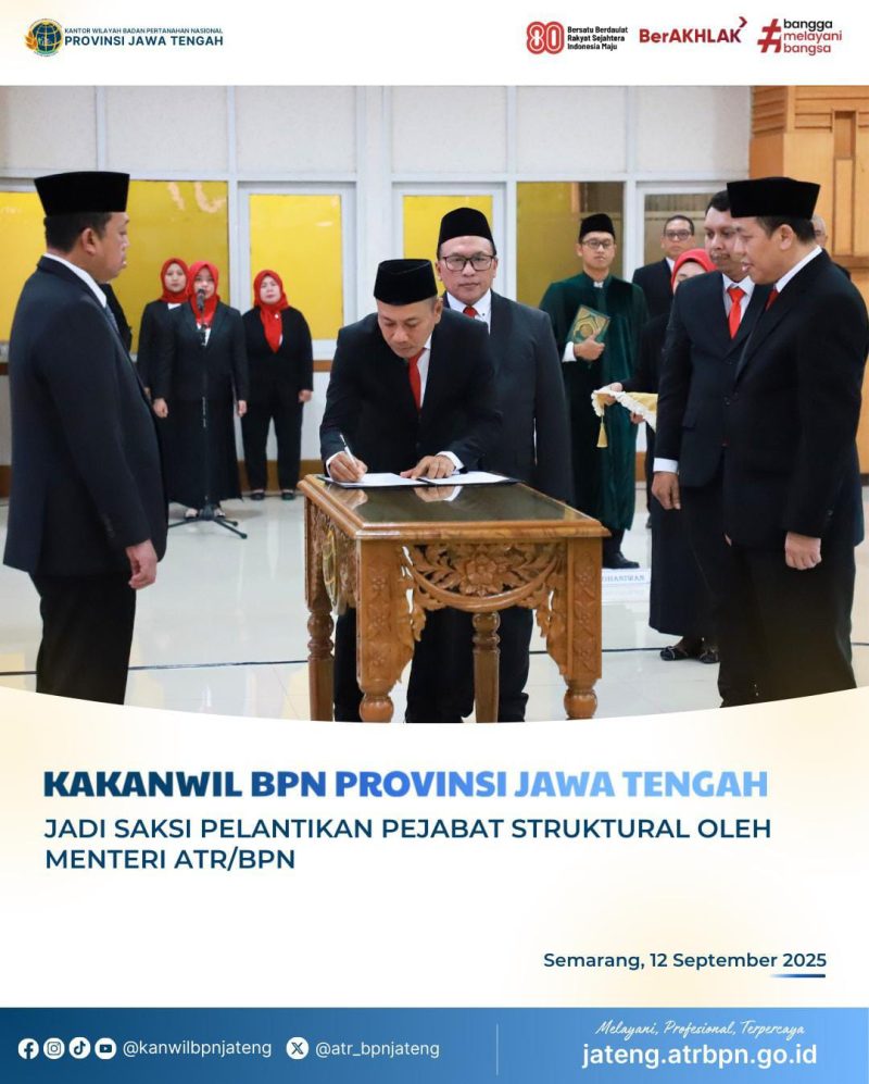 Kakanwil BPN Provinsi Jawa Tengah, hadir sekaligus bertindak sebagai saksi dalam acara pelantikan 24 pejabat struktural di lingkungan Kementerian ATR/BPN yang dipimpin langsung oleh Menteri ATR/BPN, Nusron Wahid. Kegiatan ini berlangsung khidmat di Aula Sentosa, Kanwil BPN Provinsi Jawa Tengah.
