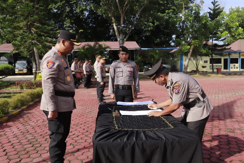 Kapolres Langkat AKBP David Triyo Prasojo SH SIK MSi memimpin Upacara Serah Terima Jabatan (Sertijab) Kasat Reskrim, Kapolsek Padang Tualang,Kapolsek Kuala,Kasat Tahti,Kasiwas dan Kasikum di Lapangan Jana Nuraga Mapolres Langkat, Senin (13/10/2025) pagi.