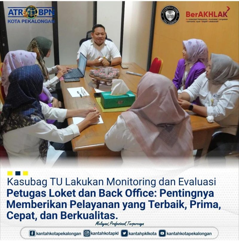 Rabu, 27 Agustus 2025 Kantor Pertanahan Kota Pekalongan terus berupaya meningkatkan kualitas pelayanan kepada masyarakat. Sebagai bagian dari upaya ini, Kepala Subbagian Tata Usaha, bersama dengan Koordinator Subtansi Umum dan Kepegawaian, melaksanakan kegiatan Monitoring dan Evaluasi (Monev) untuk para petugas loket dan back office.