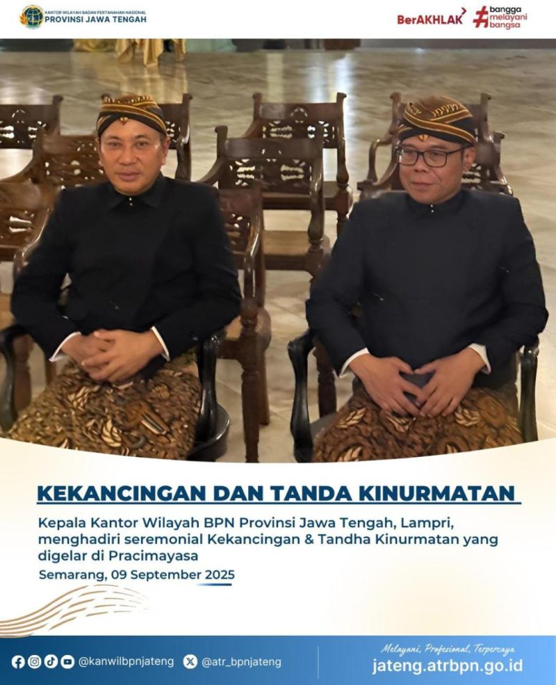 Kepala Kantor Wilayah BPN Provinsi Jawa Tengah, Lampri, menghadiri seremonial Kekancingan & Tandha Kinurmatan yang digelar di Pracimayasa, Pura Mangkunegaran. Seremonial ini menjadi simbol penghormatan sekaligus pengikat kebersamaan antara Kerajaan Mangkunegaran, Pemerintah Daerah, dan lembaga negara.