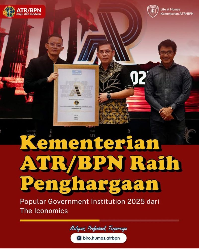 Kementerian Agraria dan Tata Ruang/Badan Pertanahan Nasional (ATR/BPN) menerima penghargaan Popular Government Institution 2025 dari Iconomics. Penghargaan ini diterima langsung oleh Kepala Biro Hubungan Masyarakat (Humas) dan Protokol Kementerian ATR/BPN, Harison Mocodompis, di Kantor Kementerian Pariwisata, Jakarta, Jum’at (08/08/2025).