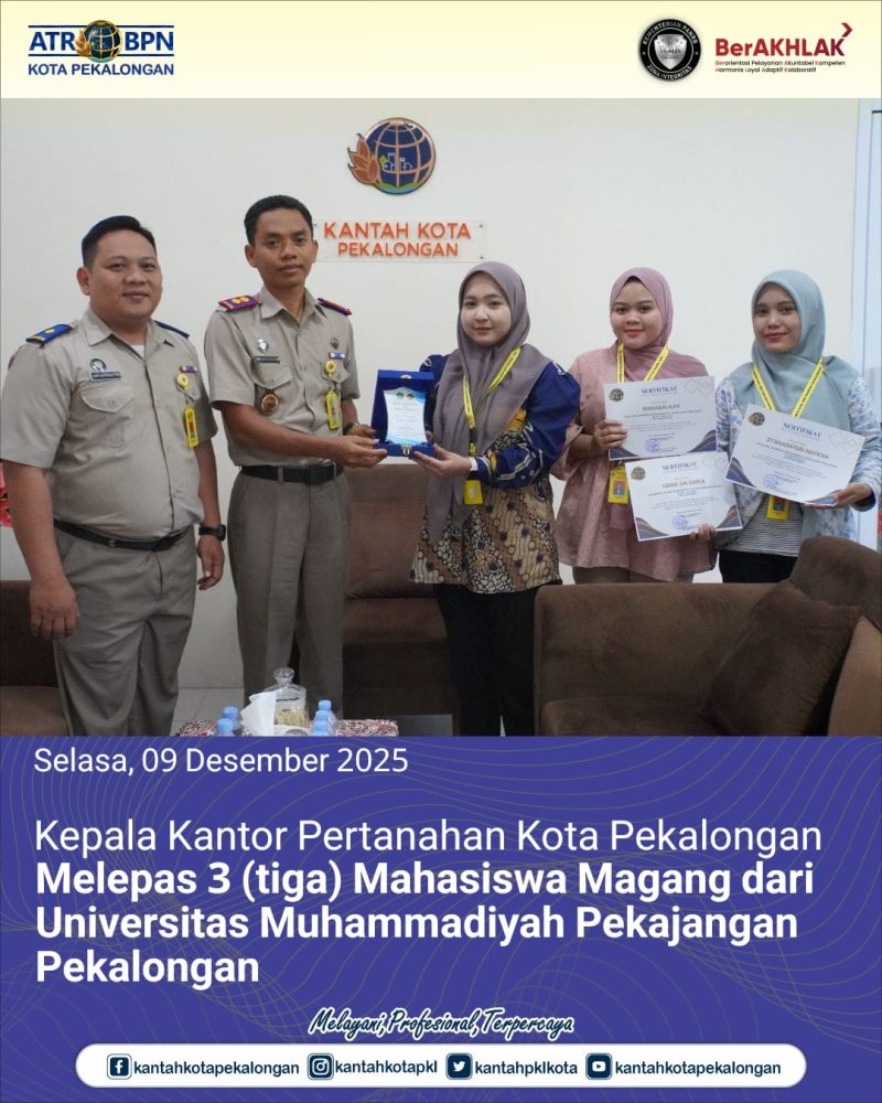 Senin, 8 Desember 2025. Kepala Kantor Pertanahan Kota Pekalongan, Bapak Joko Wiyono, secara resmi melepas tiga mahasiswa magang dari Universitas Pekajangan Pekalongan (UMPP) yang telah menyelesaikan programnya.