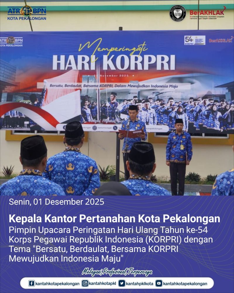 Kantor Pertanahan Kota Pekalongan melaksanakan upacara dalam rangka memperingati Hari Ulang Tahun (HUT) ke-54 Korps Pegawai Republik Indonesia (KORPRI) Tahun 2025. Kegiatan yang berlangsung pada Senin, 1 Desember 2025 ini dilaksanakan di halaman depan kantor dan dipimpin langsung oleh Kepala Kantor Pertanahan Kota Pekalongan, Bapak Joko Wiyono, serta diikuti oleh seluruh jajaran pegawai.