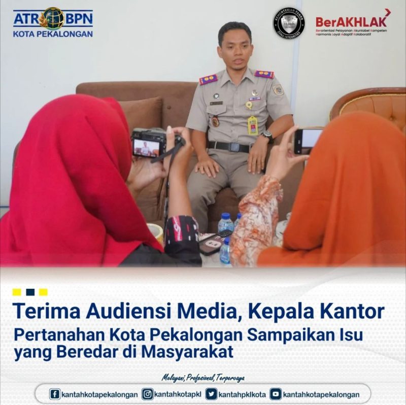 Selasa, 15 Juli 2025 Kepala Kantor Pertanahan Kota Pekalongan menerima tamu dari media lokal Batik TV dan Kominfo Kota Pekalongan untuk kegiatan wawancara perihal isu yang beredar di masyarakat tanah yang tidak bersertipikat diambil oleh negara, Joko Wiyono selaku Kepala Kantor Pertanahan Kota Pekalongan tidak membenarkan adanya informasi tersebut, Kantor Pertanahan selalu menginventarisasi tanah terindikasi terlantar pada setiap daerah, fungsinya agar tanah tersebut digunakan sesuai dengan manfaatnya oleh pemilik tanah.