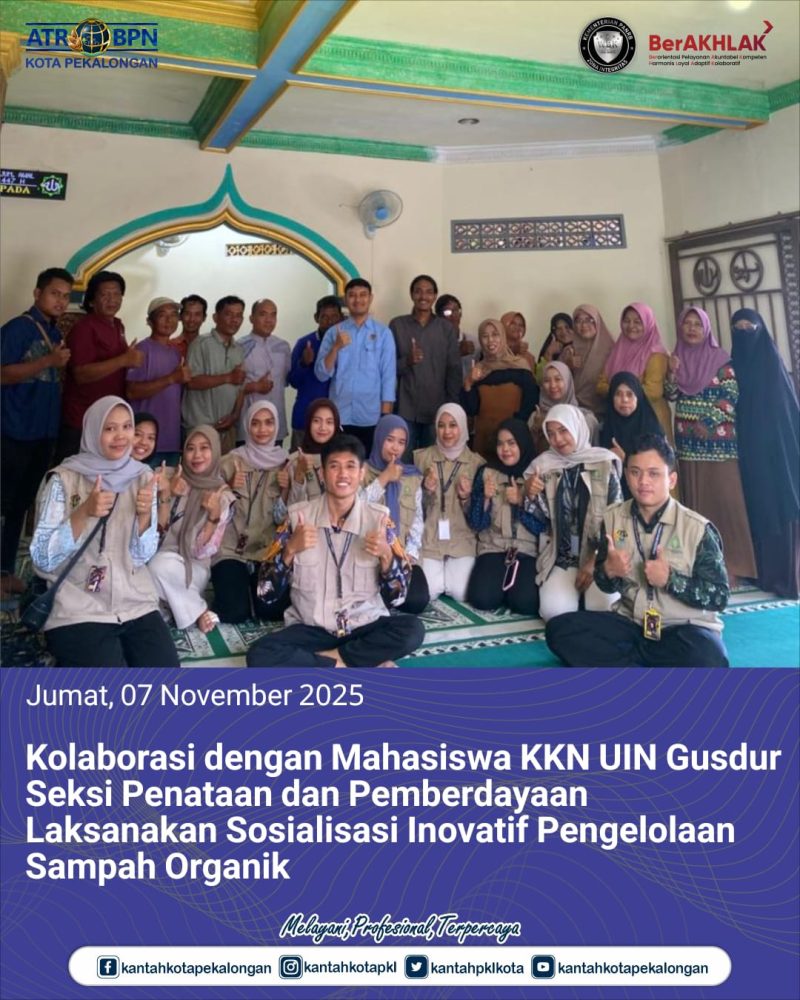 Jumat, 7 November 2025 Seksi Penataan dan Pemberdayaan Kantor Pertanahan Kota Pekalongan berkolaborasi dengan Mahasiswa Kuliah Kerja Nyata (KKN) Ekoteologi dan Pertanahan UIN Gusdur, mengadakan sosialisasi inovatif tentang Pengelolaan Sampah Organik menggunakan Maggot. Acara edukatif ini merupakan bagian dari rangkaian kegiatan Akses Reforma Agraria (ARA) di Kampung Bugisan, yang fokus tidak hanya pada penataan aset tanah, tetapi juga pada pemberdayaan masyarakat dan peningkatan kualitas lingkungan.