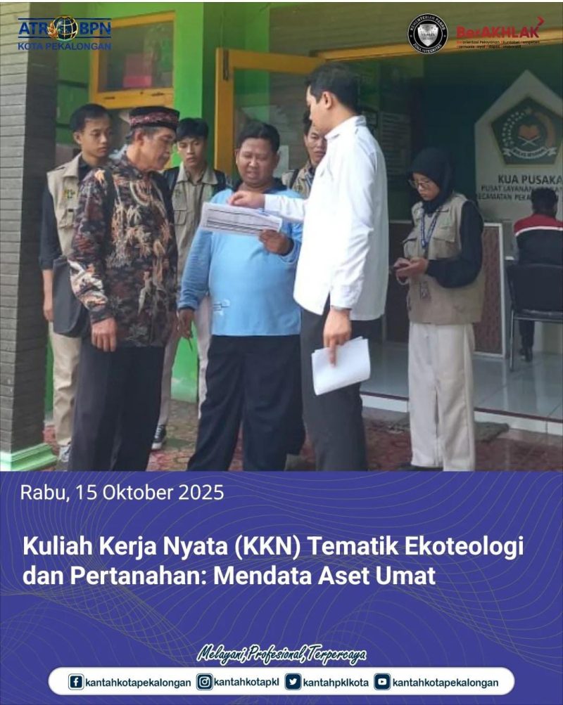 Rabu, 15 Oktober 2025 Kantor Pertanahan Kota Pekalongan menunjukkan komitmennya dalam menjamin kepastian hukum aset keagamaan. Hari kedua, Seksi Survei dan Pemetaan secara resmi memulai kolaborasi strategis dengan para mahasiswa Kuliah Kerja Nyata (KKN) Tematik dari UIN K.H. Abdurrahman Wahid Pekalongan. Kegiatan kolaboratif ini berfokus pada Identifikasi dan inventarisasi tanah wakaf yang tersebar di seluruh wilayah Kota Pekalongan.