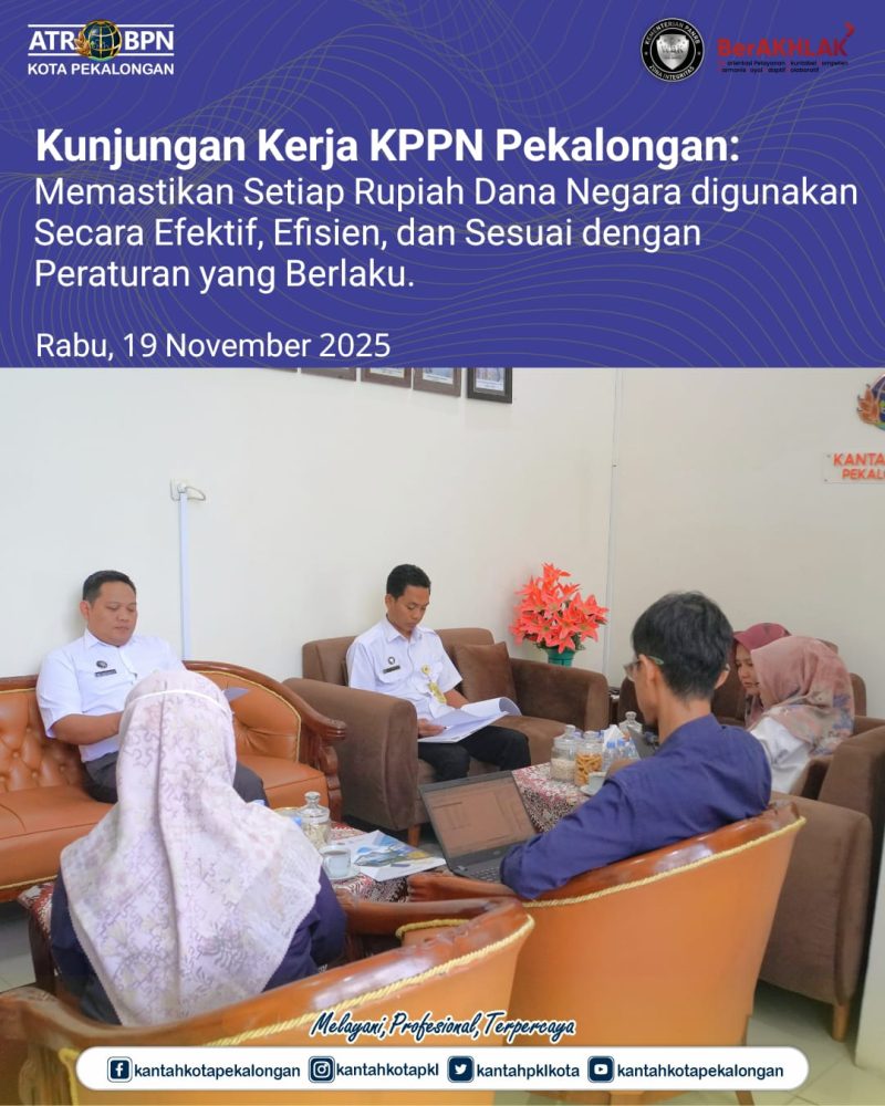Hai #SobATRBPN pada hari Rabu, 18 November 2025, Kepala Kantor Pertanahan Kota Pekalongan menerima kunjungan kerja dari Kantor Pelayanan Perbendaharaan Negara (KPPN) Kota Pekalongan. Kunjungan ini merupakan Monitoring dan Evaluasi (Monev) Pelaksanaan Anggaran di lingkungan Kantah Kota Pekalongan, memastikan setiap rupiah dana negara digunakan secara efektif, efisien, dan sesuai dengan peraturan yang berlaku. Kepala Kantor Pertanahan Kota Pekalongan, Bapak Joko Wiyono, menyambut langsung tim dari KPPN didampingi oleh Bapak Dwi Suprastyo, selaku Kepala Sub Bagian Tata Usaha.