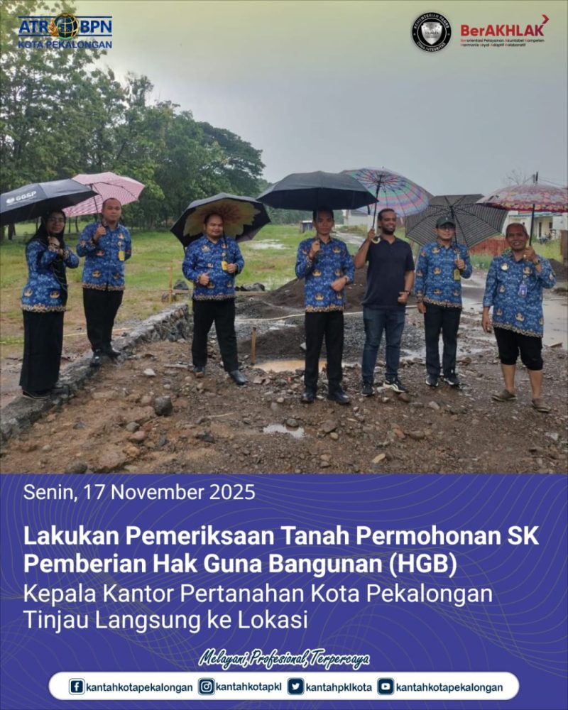 Senin, 17 November 2025 Kepala Kantor Pertanahan Kota Pekalongan, Bapak Joko Wiyono, turun langsung memimpin tim Panitia A untuk meninjau lokasi permohonan Surat Keputusan Pemberian Hak Guna Bangunan (HGB). Didampingi oleh Kepala Seksi Penetapan Hak dan Pendaftaran Tanah, Bapak Sutarno, dan Kepala Seksi Penataan dan Pemberdayaan, Bapak Satrio Agung Wibowo, kunjungan ini berfokus pada sebidang tanah yang berlokasi strategis di Kelurahan Kuripan Yosorejo, Kecamatan Pekalongan Selatan.
