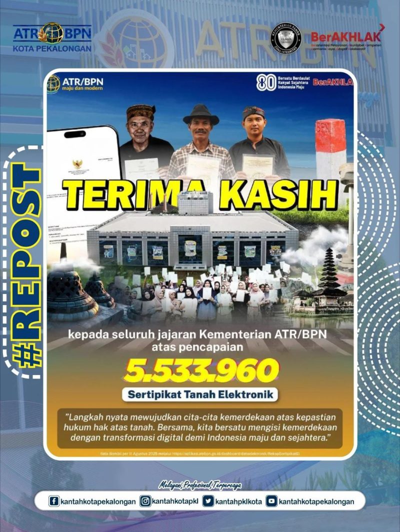 Terima kasih kepada seluruh insan pertanahan dan tata ruang atas pencapaian 5.533.960 Sertipikat Elektronik.