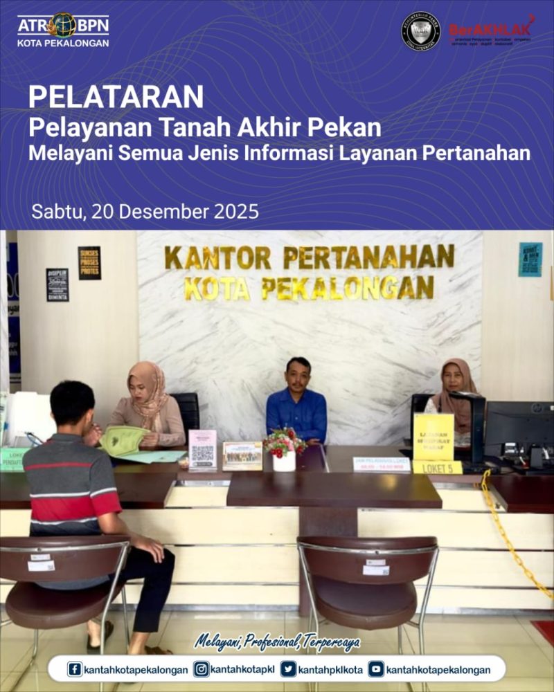 Hai #SobATRBPN pada hari Sabtu, 20 Desember 2025 Kantor Pertanahan Kota Pekalongan mengadakan Pelayanan Pertanahan Akhir Pekan (PELATARAN) yang dibuka pada hari Sabtu, pukul 08.00 WIB – 12.00 WIB.