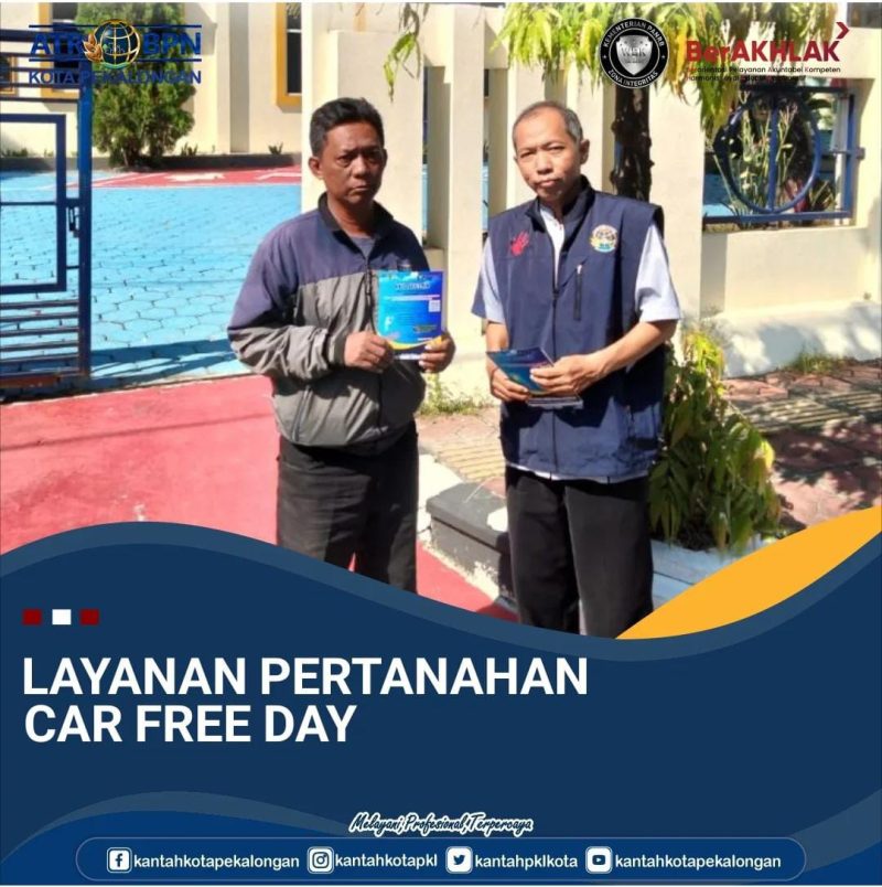 Hai Sobat #ATRBPN Kota Pekalongan pada hari Minggu, 07 September 2025 Kantor Pertanahan Kota Pekalongan memberikan pelaynan prima salah satunya ialah layanan pertanahan Car Free Day yang dilaksanakan di Lapangan Mataram Kota Pekalongan.
