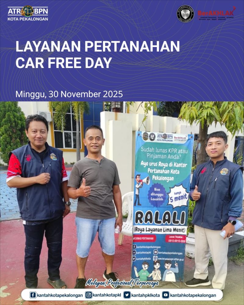 Hai Sobat #ATRBPN Kota Pekalongan pada hari Minggu, 30 November 2025 Kantor Pertanahan Kota Pekalongan memberikan pelayanan prima salah satunya ialah layanan pertanahan Car Free Day yang dilaksanakan di Lapangan Mataram Kota Pekalongan.