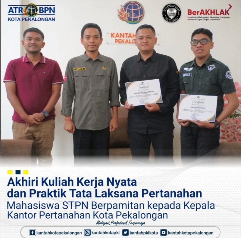 Jumat, 20 Juni 2025 dua taruna dari Sekolah Tinggi Pertanahan Nasional telah selesai melaksanakan Kuliah Kerja Nyata dan Praktik Tata Laksana Pertanahan (KKNP-PTLP) di Kantor Pertanahan Kota Pekalongan sejak tanggal 3 Februari s/d 20 Juni 2025.