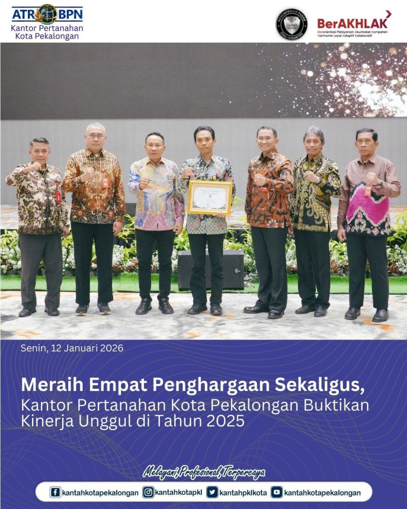 Senin, 12 Januari 2026 Kantor Pertanahan Kota Pekalongan kembali menorehkan prestasi dalam ajang Evaluasi Kinerja Tahun 2025 dan Rencana Aksi Tahun 2026 oleh Kanwil BPN Provinsi Jawa Tengah. Hadiri acara tersebut Kepala Kantor Pertanahan Kota Pekalongan, Bapak Joko Wiyono, didampingi seluruh jajaran Pejabat Pengawas di Wahid Bandungan Hotel, Kabupaten Semarang.