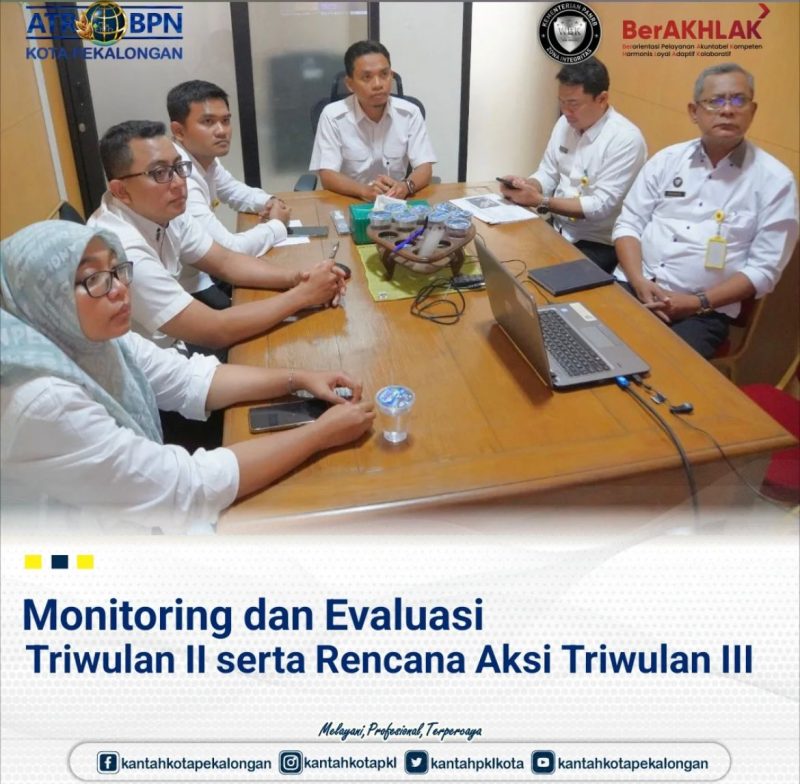 Rabu, 16 Juli 2025 Kepala Kantor Pertanahan Kota Pekalongan bersama dengan seluruh pejabat pengawas menghadiri undangan dari Kantor Wilayah BPN Provinsi Jawa Tengah tentang evaluasi triwulan II serta rencana aksi triwulan III, rapat dilaksanakan melalui daring, dipimpin langsung oleh Kepala Kantor Wilayah BPN Provinsi Jawa Tengah.