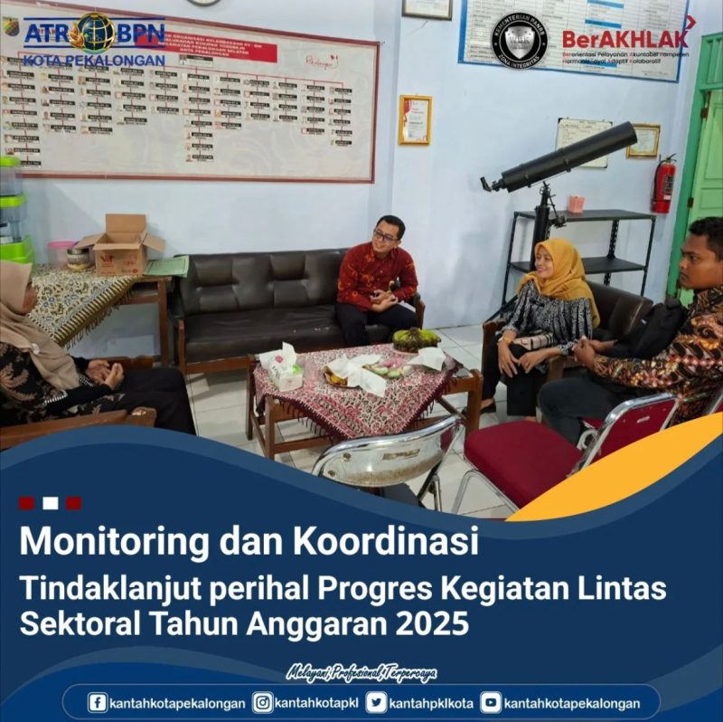 Kamis, 3 Juli 2025 Kepala Seksi Penataan dan Pemberdayaan Kantor Pertanahan Kota Pekalongan beserta tim melaksanakan monitoring dan koordinasi tindaklanjut perihal progres kegiatan lintas sektoral tahun anggaran 2025 di Kelurahan Kuripan Yosorejo, Kecamatan Pekalongan Selatan.