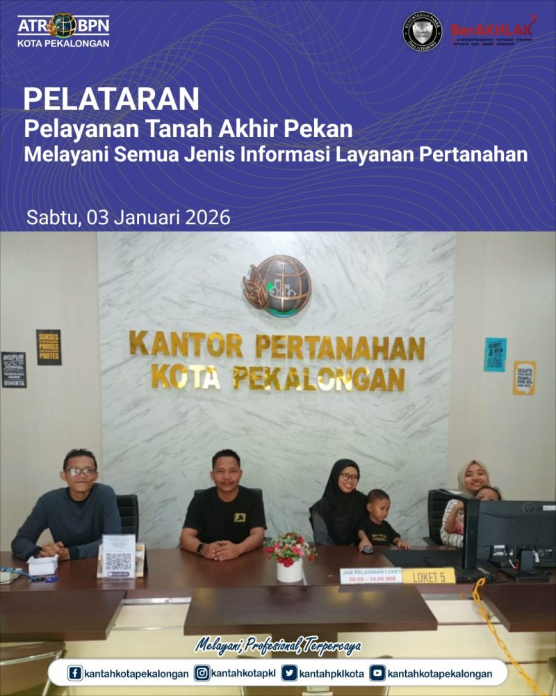 Hai #SobATRBPN pada hari Sabtu, 03 Januari 2026 Kantor Pertanahan Kota Pekalongan mengadakan Pelayanan Pertanahan Akhir Pekan (PELATARAN) yang dibuka pada hari Sabtu, pukul 08.00 WIB – 12.00 WIB.