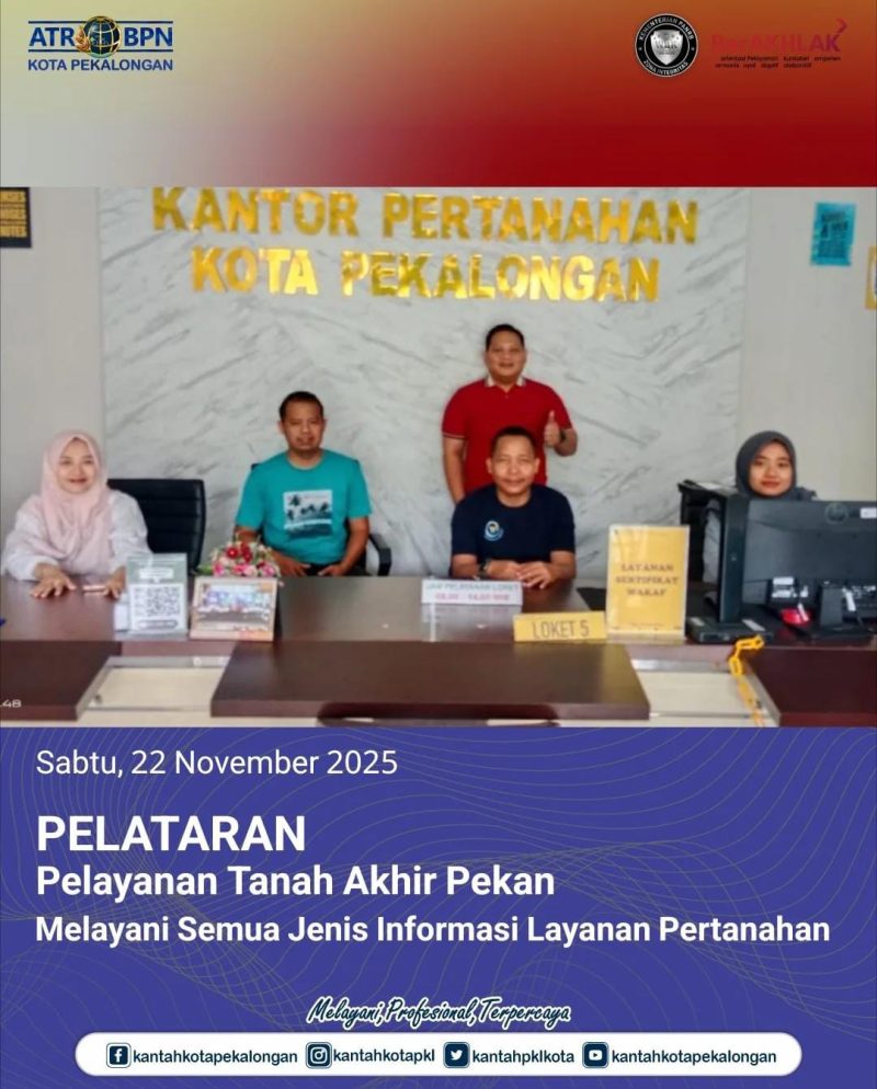 Hai #SobATRBPN pada hari Sabtu, 22 November 2025 Kantor Pertanahan Kota Pekalongan mengadakan Pelayanan Pertanahan Akhir Pekan (PELATARAN) yang dibuka pada hari Sabtu, pukul 08.00 – 12.00 WIB.