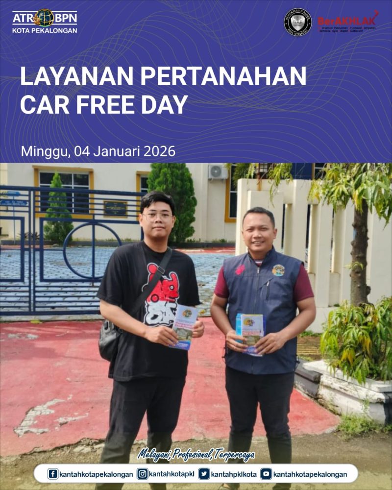 Hai Sobat #ATRBPN Kota Pekalongan pada hari Minggu, 04 Januari 2026 Kantor Pertanahan Kota Pekalongan memberikan pelayanan prima salah satunya ialah layanan pertanahan Car Free Day yang dilaksanakan di Lapangan Mataram Kota Pekalongan.