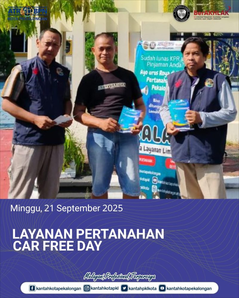 Hai Sobat #ATRBPN Kota Pekalongan pada hari Minggu, 21 September 2025 Kantor Pertanahan Kota Pekalongan memberikan pelayanan prima salah satunya ialah layanan pertanahan Car Free Day yang dilaksanakan di Lapangan Mataram Kota Pekalongan.