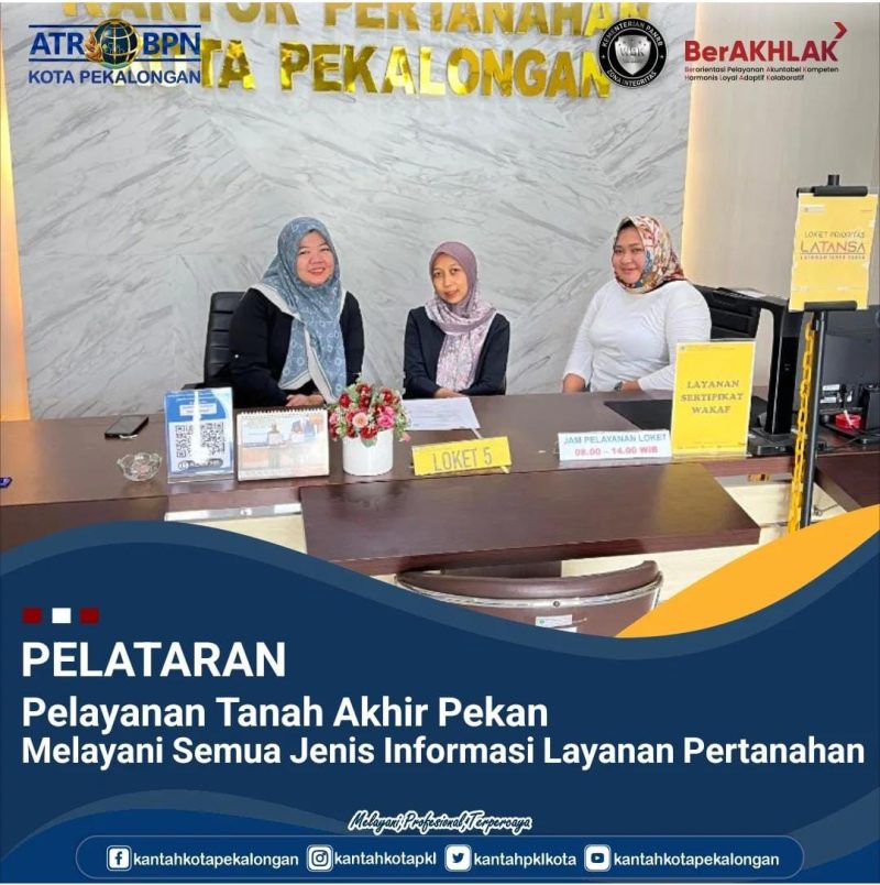 Pada hari Sabtu, 26 Juli 2025 Kantor Pertanahan Kota Pekalongan mengadakan Pelayanan Pertanahan Akhir Pekan (PELATARAN) yang dibuka pada hari Sabtu, pukul 08.00 WIB – 12.00 WIB.