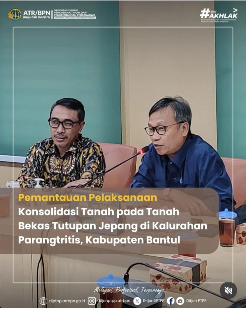 Pelaksanaan Konsolidasi Tanah (SK KT) Tahun 2025 di Kelurahan Parangtritis merupakan Tahap Kedua penyelesaian tanah bekas Tutupan Jepang, setelah tahap pertama selesai dilaksanakan dengan diserahkannya 811 sertipikat Hasil Konsolidasi Tanah oleh Menteri ATR/BPN, Nusron Wahid, Mei 2025 lalu. Dalam rapat koordinasi yang dipimpin langsung oleh Kepala Kantor Pertanahan Bantul, Tri Harnanto, disampaikan bahwa kegiatan SK KT saat ini dalam tahap identifikasi Subjek dan Objek Konsolidasi Tanah sejumlah 139 bidang. Tahap ini dilaksanakan untuk mendata informasi fisik dan yuridis dari setiap bidang tanah pada kegiatan SK KT Tahun 2025. Rapat koordinasi dihadiri oleh Bidang Pengadaan Tanah dan Pengembangan Kantor Wilayah DI Yogyakarta serta tim Pelaksana Konsolidasi Tanah Kantor Pertanahan Bantul.
