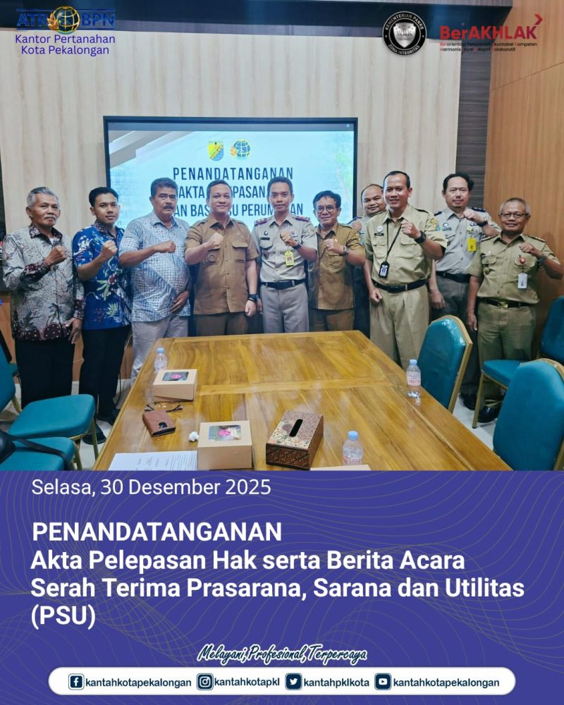 Selasa, 30 Desember 2025 Kepala Kantah Kota Pekalongan, Bapak Joko Wiyono, menghadiri undangan dari Sekretariat Daerah (Setda) terkait Penandatanganan Akta Pelepasan Hak serta Berita Acara Serah Terima Prasarana, Sarana, dan Utilitas (PSU) Perumahan. Bertempat di Ruang Tiga Negeri, Setda Kota Pekalongan, agenda ini memastikan aspek legalitas fasilitas umum dan fasilitas sosial dari pihak pengembang kepada pemerintah daerah.