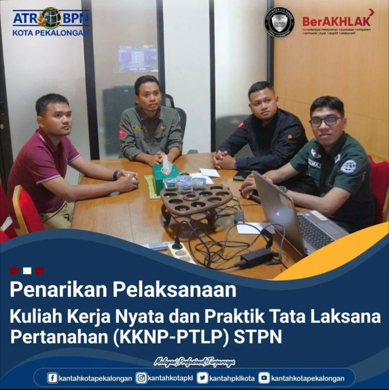 Jumat, 20 Juni 2025 Kepala Kantor Pertanahan Kota Pekalongan bersama dengan Kepala Subbagian Tata Usaha menghadiri undangan via daring aplikasi zoom meeting dalam rangka kegiatan rapat penarikan pelaksanaan Kuliah Kerja Nyata dan Praktik Tata Laksana Pertanahan (KKNP-PTLP) Sekolah Tinggi Pertanahan Nasional.